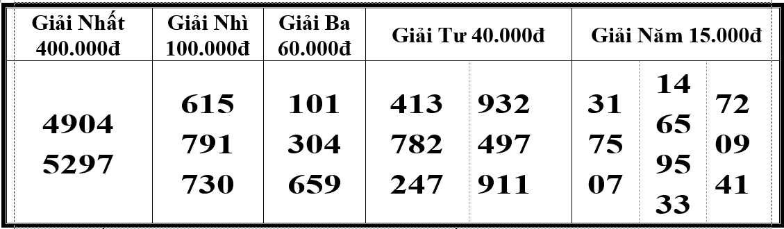 | 01 GIẢI ĐẶC BIỆT TRỊ GIÁ 6.000.000 đồng 78349 Giải khuyến khích (có số hàng chục và hàng đơn vị trùng với số hàng chục và hàng đơn vị của giải đặc biệt ) mỗi giải 15.000đ: 49 ![]() - Vé trúng nhiều giải sẽ được lĩnh đủ giá trị các giải (không bao gồm giải đặc biệt). - Chấm dứt lưu hành loại vé xổ số Bóc ký hiệu B58 vào ngày 04/4/2026. Thanh toán dứt điểm ngày 14/4/2026./. |