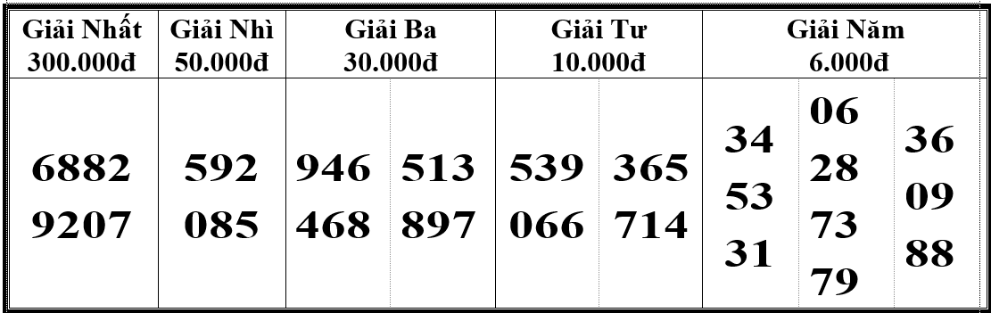 Theo biên bản mở thưởng ngày 06 tháng 08 năm 2025 - Tại Công ty TNHH MTV Xổ số kiến thiết Hải Dương Ký hiệu M14. Mệnh giá vé 2.000 đồng 02 GIẢI ĐẶC BIỆT TRỊ GIÁ MỖI GIẢI 3.000.000 đồng 25680-79130 Giải khuyến khích (có số hàng chục và hàng đơn vị trùng với số hàng chục và hàng đơn vị của giải đặc biệt ) mỗi giải 6.000đ: 80-30 ![]() - Vé trúng nhiều giải sẽ được lĩnh đủ giá trị các giải (không bao gồm giải đặc biệt). - Chấm dứt lưu hành loại vé xổ số Bóc ký hiệu M09 vào ngày 28/09/2025. Thanh toán dứt điểm ngày 08/10/2025./. |